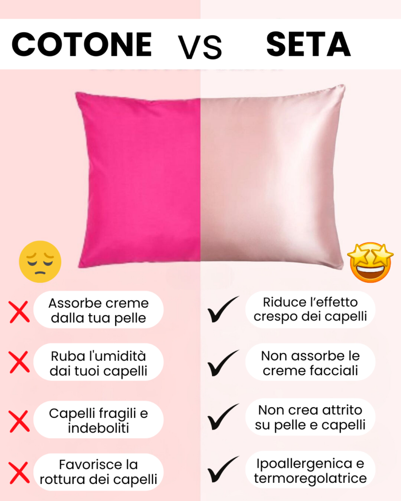❌Il cotone, a differenza della seta, crea attrito ed assorbe la naturale idratazione di pelle e capelli. Ecco perchè ti svegli la mattina con i capelli crespi, disordinati e con le pieghe del cuscino sul viso.